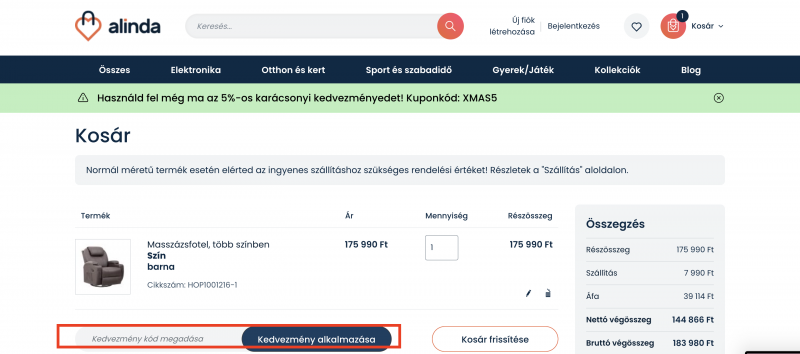 A kosárban a jobb alsó sarokban található "Kedvezményes kód megadása" szövegmező található, ahol beírja a kedvezménykódot és megadja a "Kedvezmény alkalmazása" lehetőséget.